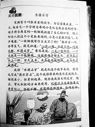 近日,北京二中亦庄学校五年级女生张秋实,在学习语文教科书里成语故事“水滴石穿”时发现,书中一幅配图有误:宋朝知县的官服应为青绿色,而不是紫色。她还指出图中官帽上下垂的帽翅也与历史不符。发现这条疑似错误之后,教张秋实语文的王老师建议她首先核对错误是否属实。于是,在王老师的鼓励和支持下,张秋实给人民教育出版社写了一封信,指出了这个语文课本配图的疑问。