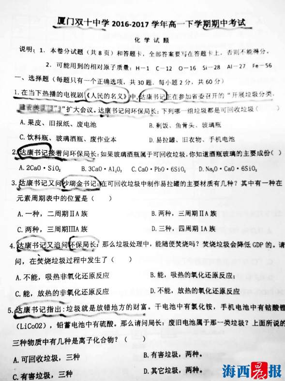 最近电视剧《人民的名义》大火,戏中的“达康书记”随即也在网上走红,被制作成了各类表情包。近日,“达康书记”也进入了厦门双十中学的一份高一化学期中考试卷中,这份结合“达康书记”和垃圾分类知识的化学试卷在朋友圈中爆红。这份爆红网络的试卷,出自厦门双十中学特级教师肖培林之手。这位学生口中“可爱的肖老头”,在双十中学因改编功力无敌而成了和“达康书记”齐名的“男神”。