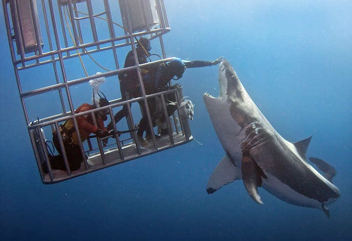 摄影师厄克 斯贝克透露了他是怎么记录下这惊魂一刻的:“为了拍摄这一画面,我连续三天每天在笼子里呆上6个小时。食物是唯一引诱大白鲨靠近的方法,所以我们把大块的金枪鱼绑在管子上,向笼子前方投去。”斯贝克还以全景模式记录下了这头15英尺长,3500磅(约1587.5千克)重的大白鲨的雄伟一跃。