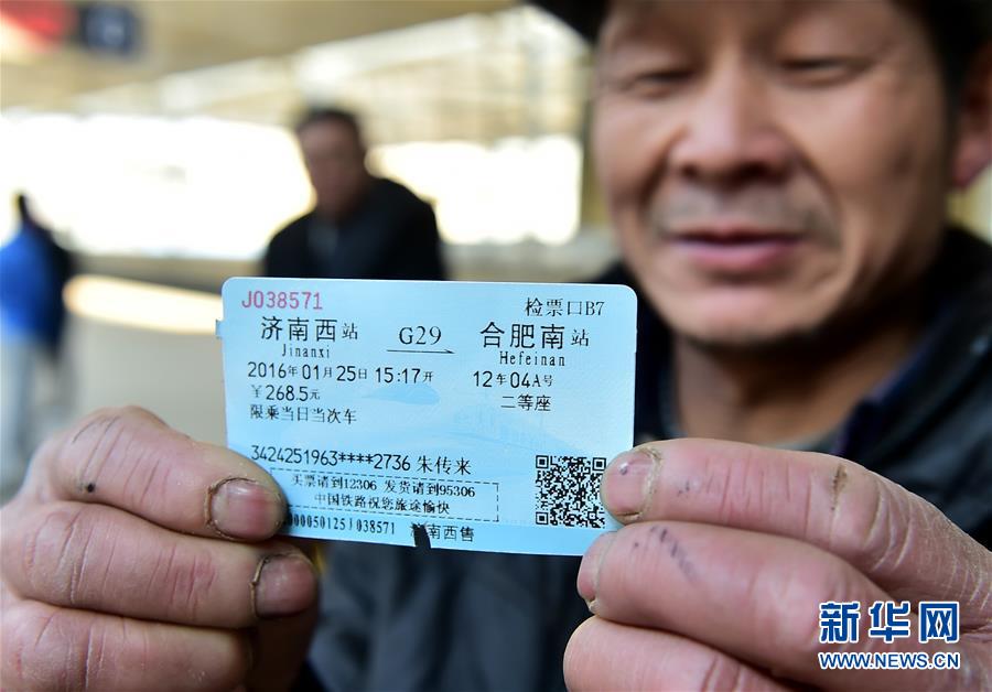 今年53岁的朱传来是安徽舒城县人,5年前他跟随同乡来到山东济南的一处工地上做木工。春节临近,拿到工钱的朱传来购买了从山东济南到安徽合肥的高铁票,带着行李和给家人的礼物踏上了回乡的旅程。朱传来说:“如今在外打工一年也能赚五六万块钱,我们农民工也能坐得起高铁了。济南到合肥的高铁200多块钱,虽然比100多块钱的普通列车贵了一倍,但是乘车时间却大大缩短了。” 新华社记者刘军喜摄