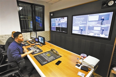 在李伯雄在家的“课间”休息片刻,北京二中的4G课程教室可一点都没闲着。在这间架着大大小小直播设备、仿若电视台直播间的专业教室里,下一节直播课的授课老师——物理教师范京正在准备中,工作人员也正忙着清场,“ 还有两分钟就要开始网络课程直播了,无关人员不得进入”。