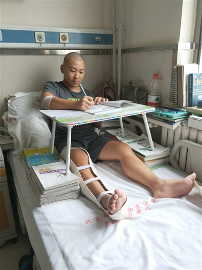 新学期开学,本该上高二的杨汶宪却住进了北京的医院。3年前,他被诊断出患有恶性骨瘤,辗转国内各大医院治疗,已经花费各种治疗费用70余万。今年5月,他病情开始恶化,再次被送到医院,担心住院后学习跟不上,这一次,他带上课本自学,他不想因为生病将成绩落下。