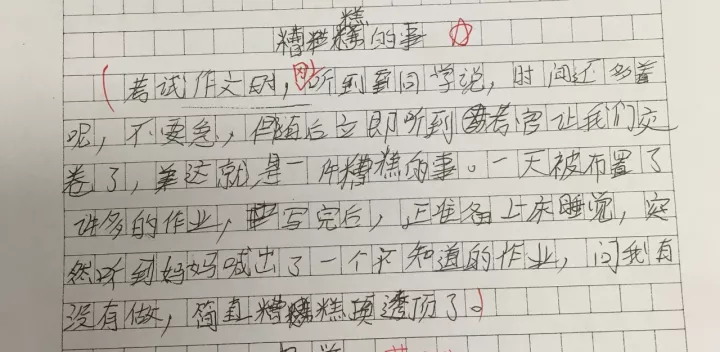 △ 考试作文时,刚听到同学说,时间还多着呢,不要急,但随后立即听到考官让我们交卷了,这就是一件糟糕的事。一天被布置了许多的作业,写完后,正准备上床睡觉,突然听到妈妈喊出了一个不知道的作业,问我有没有做,简直糟糕透顶了。