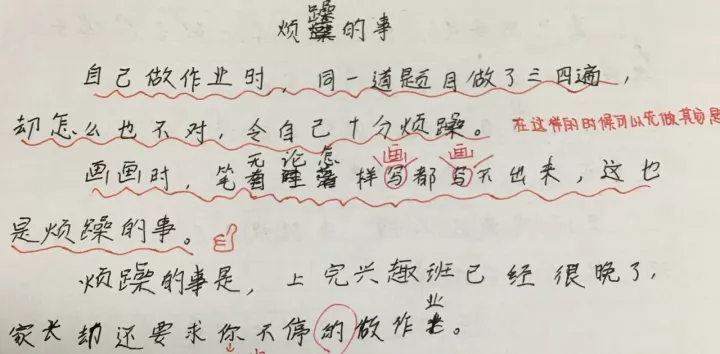 △ 自己做作业时,同一道题目做了三四遍,却怎么也不对,令自己十分烦躁。画画时,笔无论怎样画都画不出来,这也是烦躁的事。烦躁的事是,上完兴趣班已经很晚了,家长却还要求你不停地做作业。