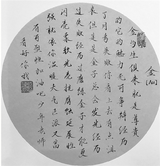 比如,有位同学对应的化学元素是“金”。陈老师的评语是这样写的:“金与生俱来就是尊贵的,它的魅力无可争辩。经历了月考失败,你看上去有点沮丧,但是是金子总会发光,经历过失败,经历过磨炼,金子才能更闪亮、柔软、光亮、抗腐蚀、延展性强,就像你温暖、大气、正派又富有可塑性。”