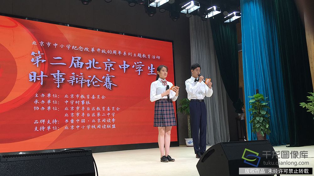5月5日上午,北京市中小学纪念改革开放40周年系列主题教育活动“第二届北京市中学生时事辩论赛”启动仪式在丰台二中举行。图为活动现场。千龙网记者王焕摄