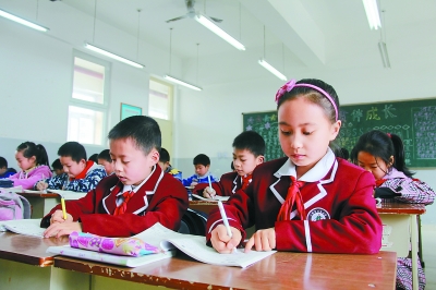 ◀什邡北京小学的学生在课堂做习题,身后的黑板报上写着“好习惯伴成长”。
