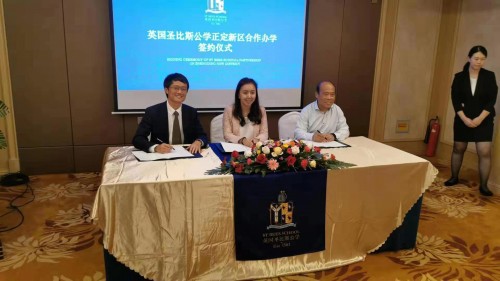 英国圣比斯公学近日在河北石家庄正定新区举行了简单而隆重的签约仪式。福美实业集团董事长吴永辉先生、枫叶林集团董事长马津月女士、合一教育集团董事长兼圣比斯公学董事会主席王德志先生共同签署了建立英国圣比斯公学石家庄分校的合作协议书。此次项目得到英国各界的高度重视及支持,英国剑桥市市长Gerri Bird女士及先生Alan Pooley、香港前教育局局长吴克俭先生亲自到现场见证了这次签约仪式。