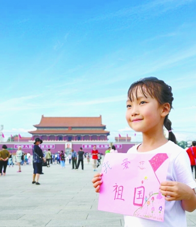 为庆祝中华人民共和国成立70周年,家住朝阳区的小娜,在完成老师布置的“我为祖国献礼”作业后,特意来到天安门拍照。小朋友用画笔描绘出对祖国的热爱,表达了对祖国深深的祝福。赵承顺摄