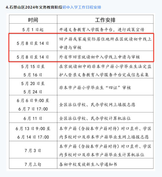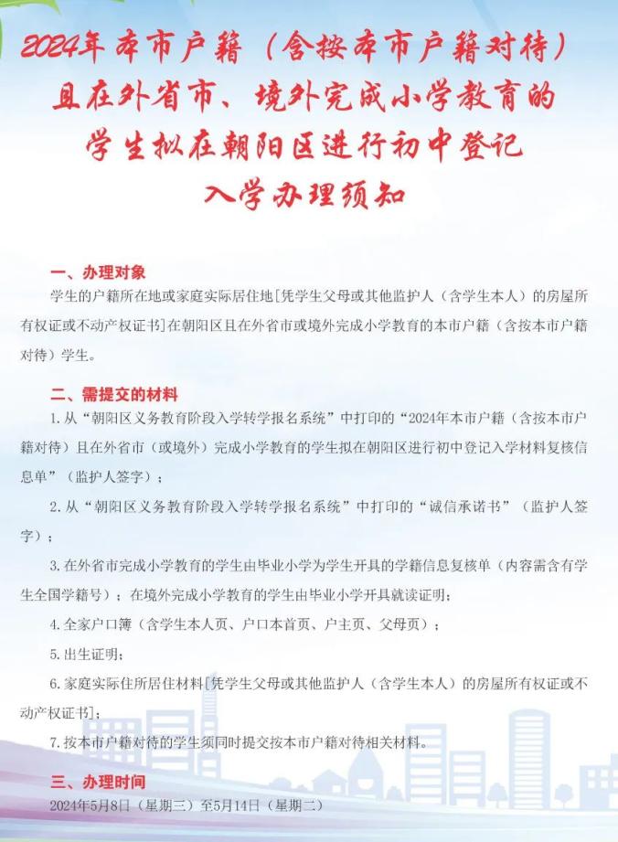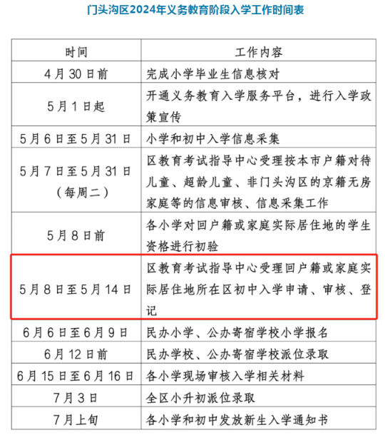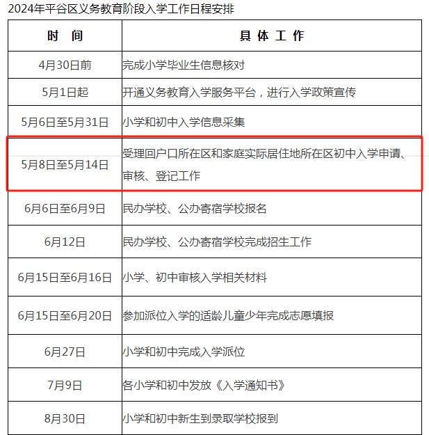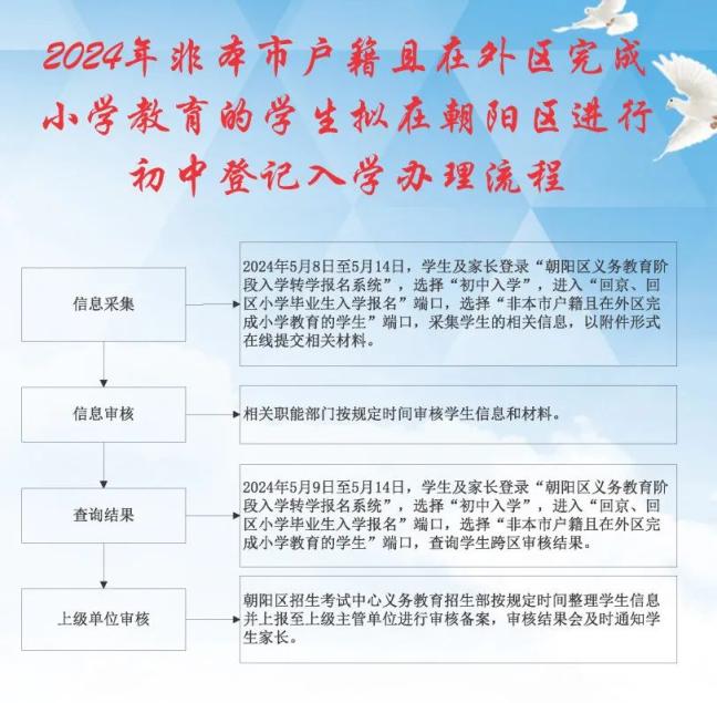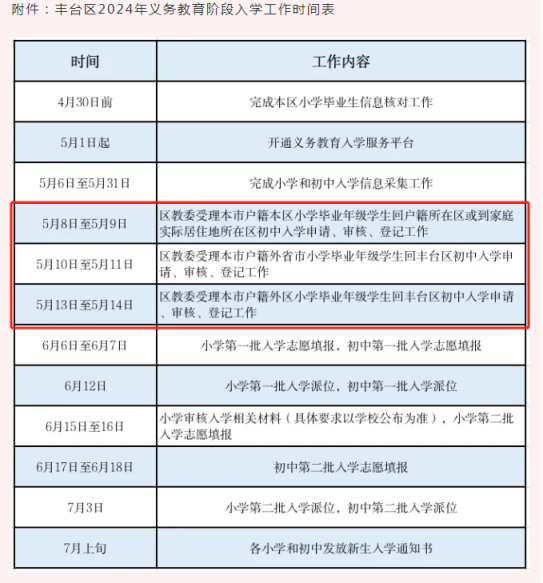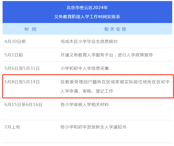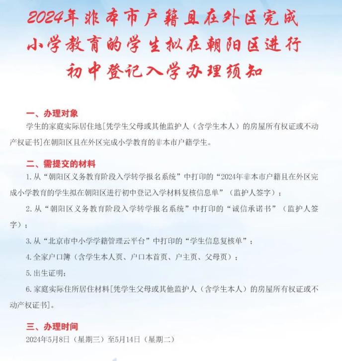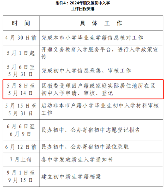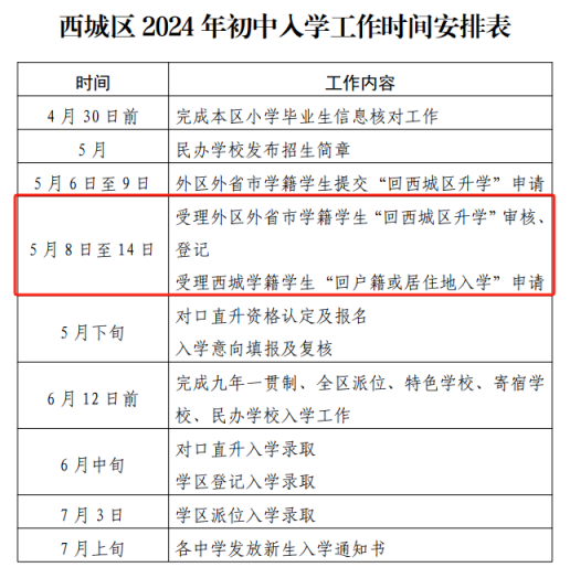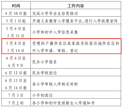 按照市教委的统一安排,5月8日至5月14日各区受理回户籍或家庭实际居住地所在区初中入学的申请、审核、登记工作。学生就读小学需为学生从初中入学服务系统中提交申请,转出区审核通过后,家长可到入学区办理相关手续。请注意办理时间,错过将影响入学。