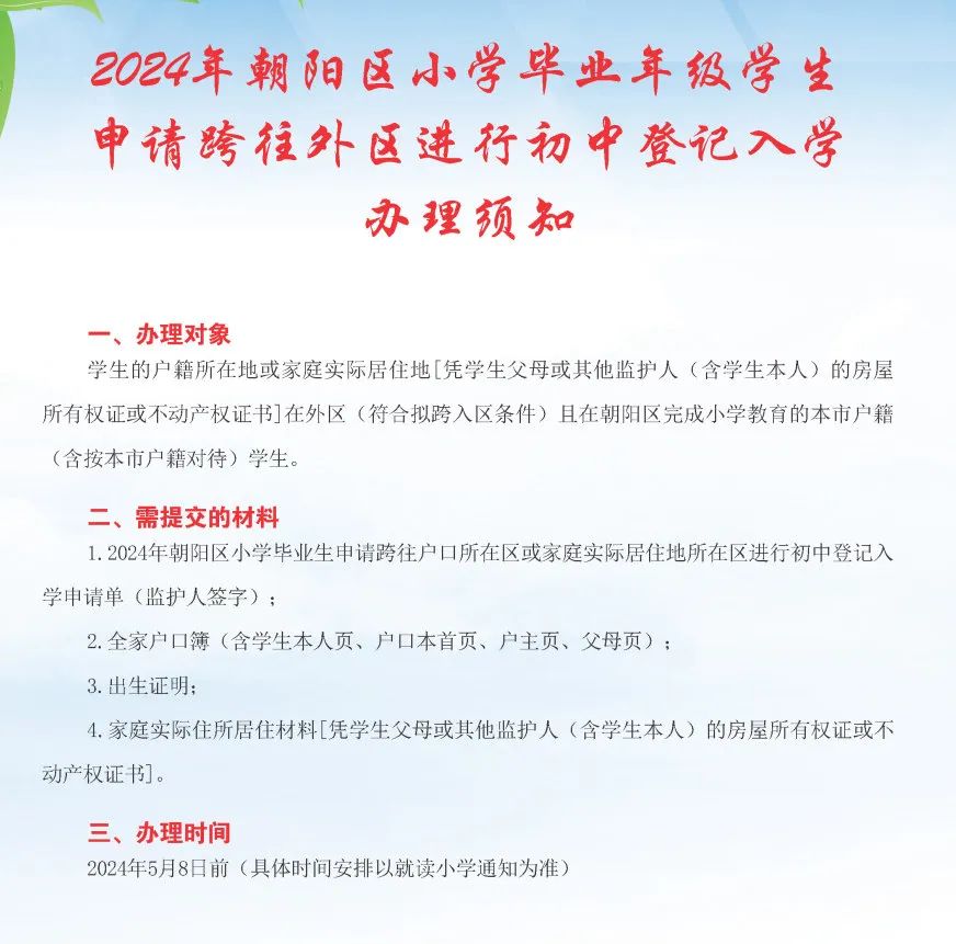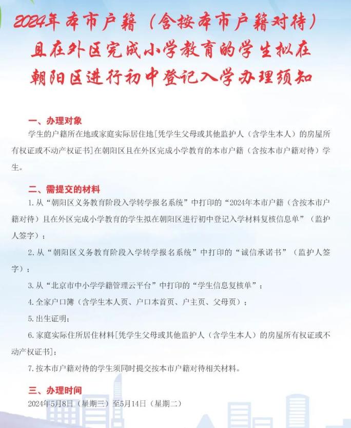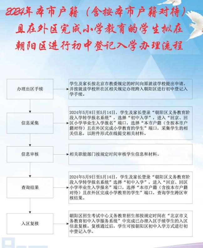 本区与5月8日—14日受理回户口或家庭实际居住地所在区初中入学申请、审核、登记工作,逾期不予办理。家长持全家户口簿、《房屋所有权证》或《不动产权证书》等相关材料联系学籍所在小学进行初审,符合条件的,学校在初中入学平台上提交转出申请,家长联系考试中心幼小初招生办公室办理审批手续,再联系户口或家庭新住址所在区招生部门办理登记手续,原学籍所在区不再保留其初中入学资格。