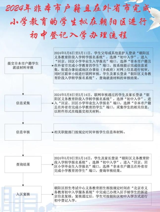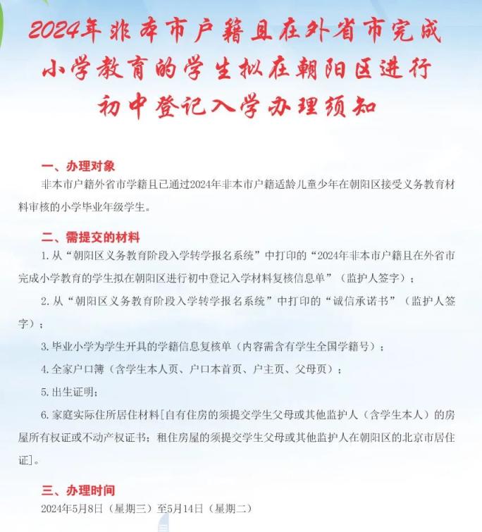 凡在顺义区或外省市完成小学教育的非本市户籍学生,需要在顺义区接受初中教育的,依照《2024年非本市户籍适龄儿童少年在顺义区接受义务教育材料审核实施细则》,由其父母在规定时间内携带有关材料,到居住地所在街道办事处或镇人民政府参加入学资格审核,通过后进入入学程序。