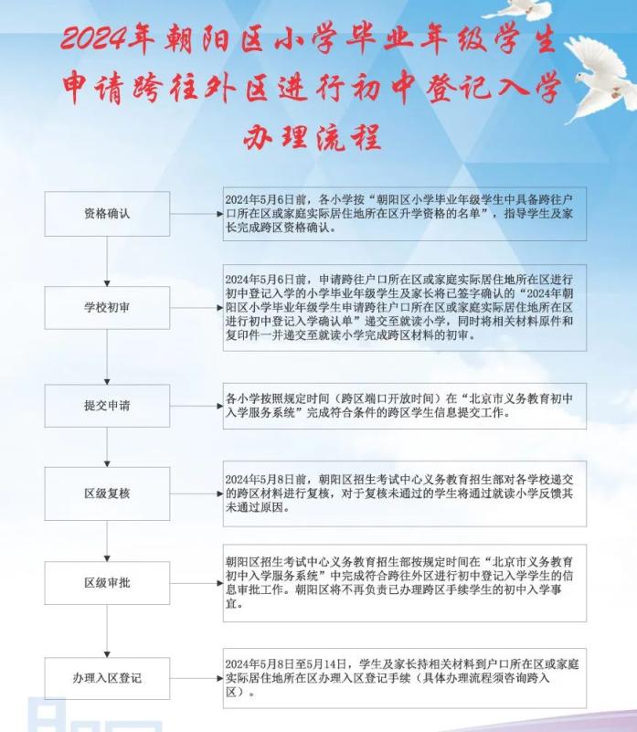 回户籍所在地或家庭实际居住地入学的学生需向毕业学校提出申请,签字确认后通过义务教育入学服务平台审核。转出区审核后,转入区再审核,通过后将信息自动推送到转入区。