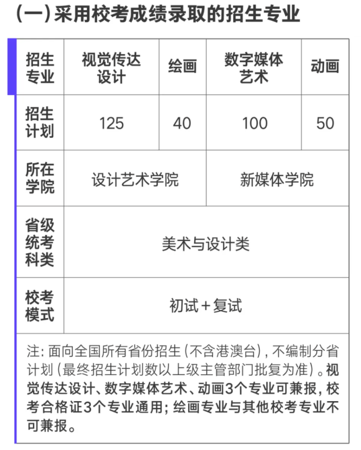 2026年服装与服饰设计、数字媒体艺术、视觉传达设计、表演(服装表演)专业在省级统考合格的基础上组织校考,面向全国招生,不编制分省计划。