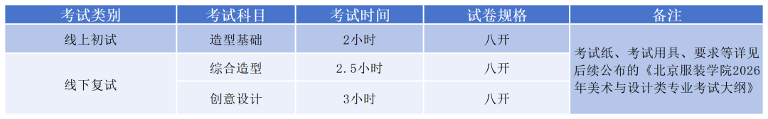 1月12日16:00至18日12:00,考生登录北京服装学院本科生招生网,进入“2026年美术与设计类考试报名入口”按要求完成线上初试报名。线上初试时间为1月22日上午。初试结果拟于2月3日左右公布。