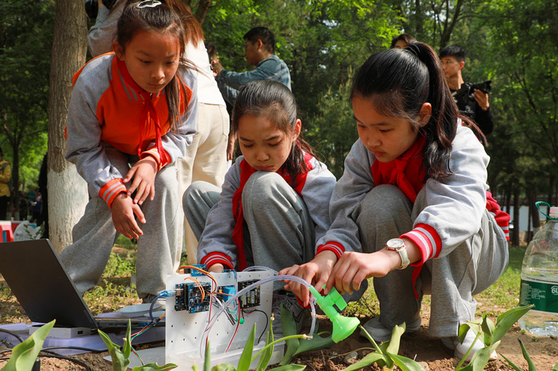 丰台五小新发地分校的孩子们结合长期户外鸟类观测经验,自主设计并3D打印了“数智鸟巢”,贴合鸟类栖息习性,践行生态保护理念;北京十二中附小的孩子们结合气象知识观察植物生长变化、借助传感器实测土壤温湿度,让数学、生物、物理、信息技术等多学科知识在实践运用中相融共生;建华学校的同学们实地监测公园环境,记录温湿度、风速等数据,分析花粉浓度影响因素,自主研发了花粉浓度探测仪,还制作热力图分享给市民,以科创能力服务城市生活;北京十二中学生依托园林科普基地开展树苗栽种,在松土、定植、浇灌的实操中掌握劳动技能,让耕耘的美好在实践中悄然生长。